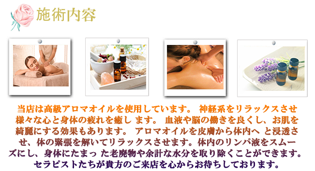 当店では、アロマオイルの効能と当店自慢のセラピストによるリンパマッサージの相乗効果による、癒しのひとときをお客様お一人お一人にお届けしております、自然で心やすらぐ優美な香りを、施術中はもちろんご帰宅お休みになってから翌日朝目覚めでまで楽しんで頂けます、どうぞゆっくりご堪能ください。
